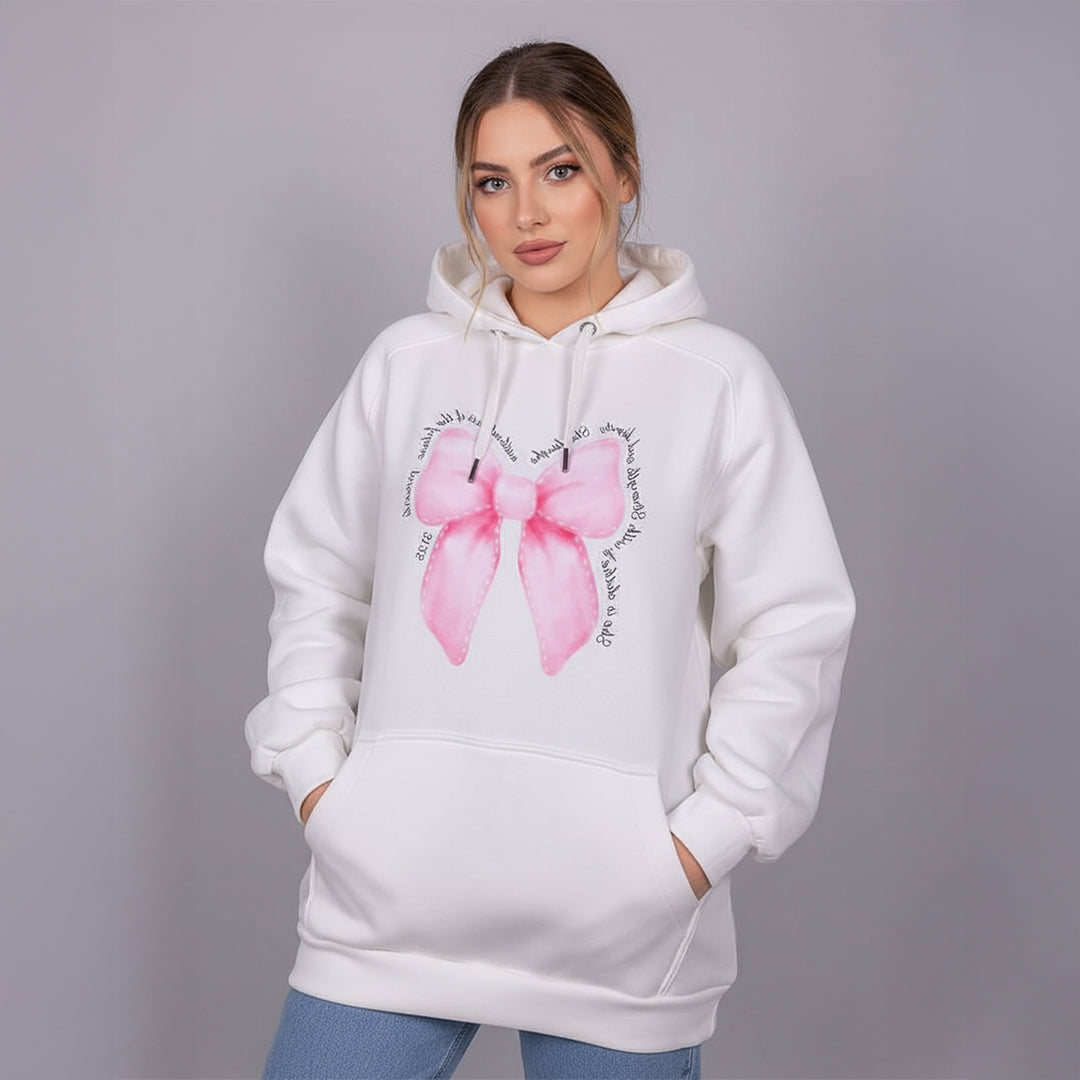 القطعة متوفرة باللون الأبيض الثلجي مع طبعة فيونكة وردية لامعة تضيف لمسة أنثوية مميزة 🎀
